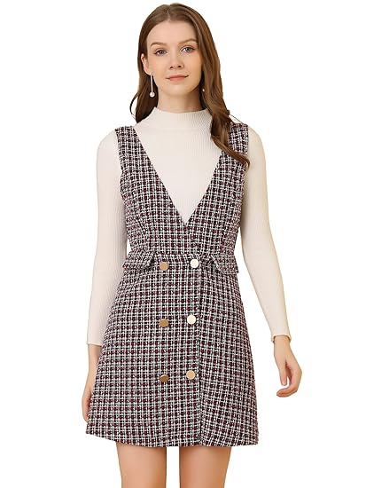Buy Allegra K Women S Elegant Vintage Button Front V Neck Plaid Tweed Overalls Pinafore Dress Red X Large At Amazon In